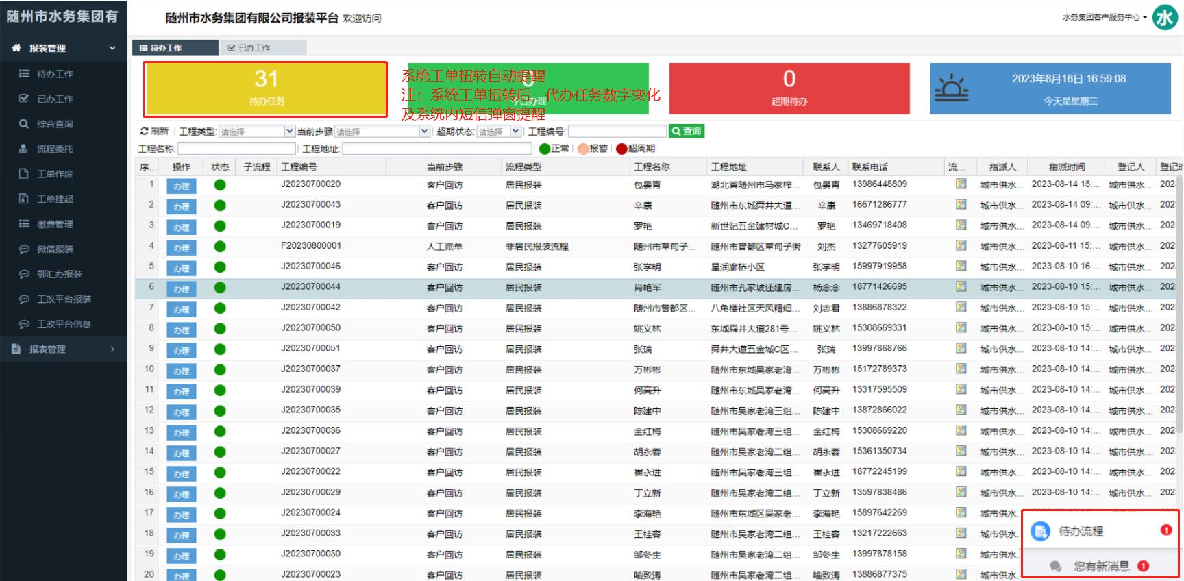 (4)報裝業(yè)務系統(tǒng)自動流轉提醒,功能界面截圖