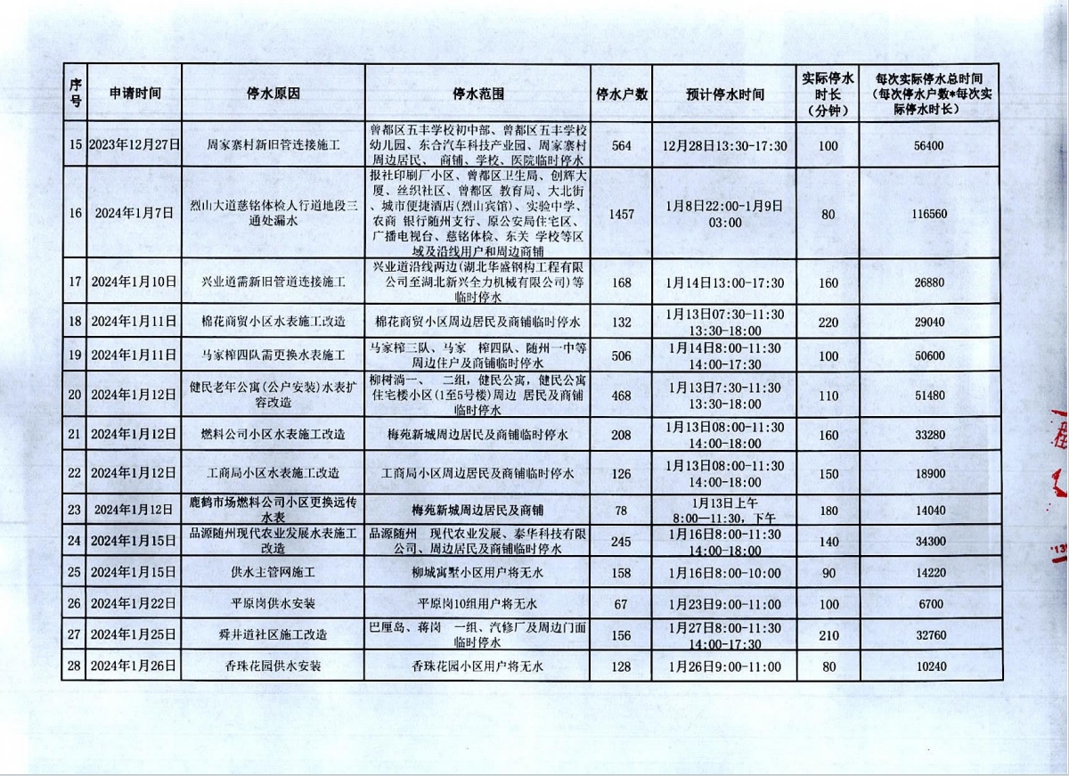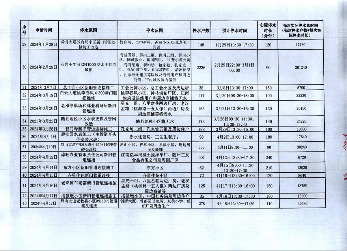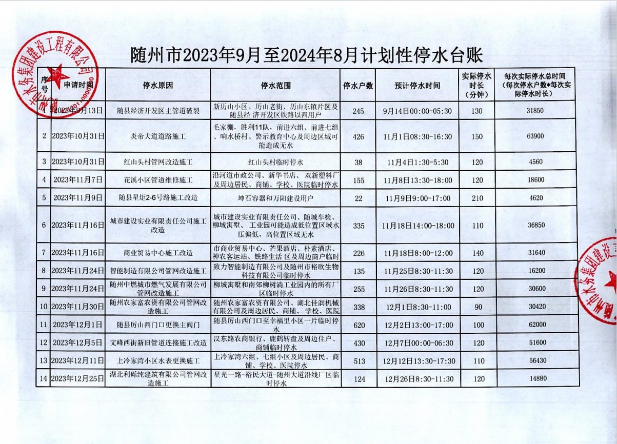您的位置:首頁 > 營商環(huán)境> 隨州市2023年9月至2024年8月計劃性停水資料