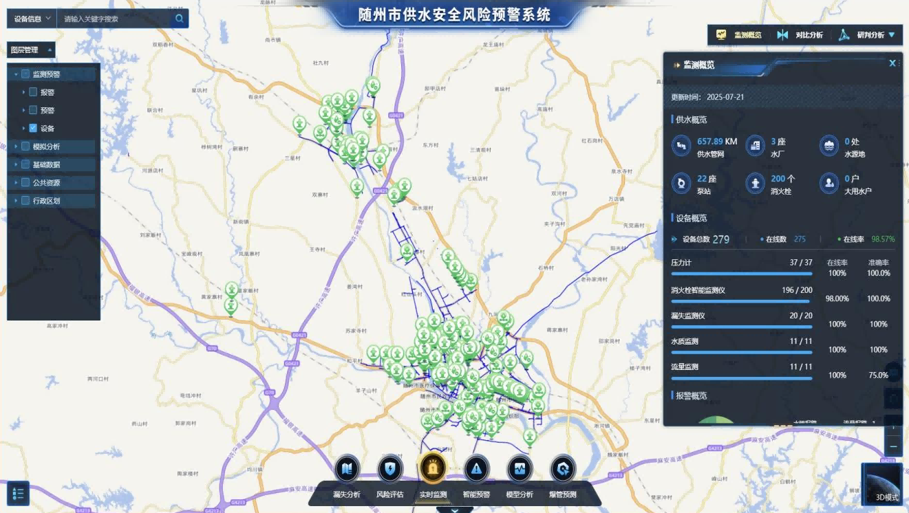 此次智慧水務(wù)建設(shè)的核心成果,是搭建起全市統(tǒng)一的智慧水務(wù)綜合管理平臺。這一平臺猶如功能強大的“中樞神經(jīng)系統(tǒng)”,高效匯聚著全市供水設(shè)施產(chǎn)生的海量實時運行數(shù)據(jù)。借助深度的數(shù)據(jù)挖掘、智能分析與可視化呈現(xiàn)技術(shù),實現(xiàn)了從水源、水廠、管網(wǎng)到二次供水乃至用戶終端的全鏈條精細(xì)化管理。它不僅讓供水服務(wù)的響應(yīng)速度得到顯著提升,更使隨州水務(wù)的運營效率大幅優(yōu)化,為城市水資源的科學(xué)調(diào)度和高效利用提供了堅實有力的決策支撐。