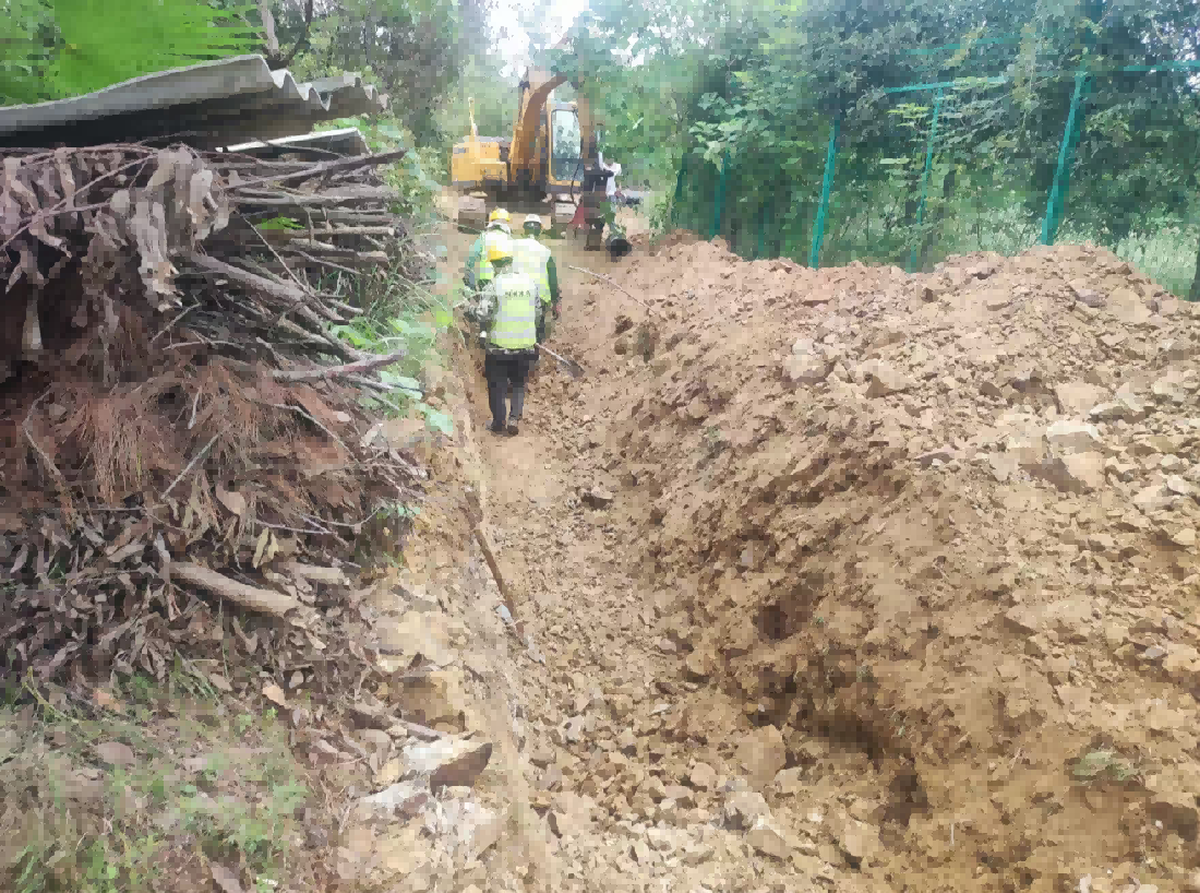 機電學校DN250球墨管供水工程線路處于山地丘陵地帶,沿線涉及鄉(xiāng)村道路、開墾菜園、陡峭山體等多重地質(zhì)和復雜環(huán)境考驗。在沿機電學校圍墻邊緣鋪設段,鄉(xiāng)村道路與圍墻之間不足3米的狹窄空間,成為施工線路上的“攔路虎”,該道路是周邊居民日常出行的主要通道,一旦長時間阻斷,將嚴重影響群眾生活。項目部與學校和村委共同研討下,最終確定利用2天時間,集中突擊,調(diào)用多臺設備,全力沖刺,快速施工完成后復路于民,順利啃下硬骨頭。